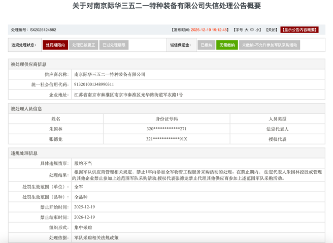 根据联勤保障部队采购管理部门发布的《关于对南京际华三五二一特种装备有限公司失信处理公告》(编号:SX2025124882)显示,经调查核实,南京际华三五二一特种装备有限公司在参加项目编号:2021-JQ05-W1343<2>采购活动中,存在履约不当等违规行为。根据军队供应商管理相关规定,1年禁止南京际华三五二一特种装备有限公司全军物资工程服务采购活动的处罚。