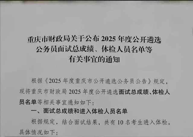 当天,重庆市财政局人事教育处出具的《关于公布2025年度公开遴选公务员面试总成绩、体检人员名单等有关事宜的通知》称,根据相关规定,结合面试结果,共有10名考生进入体检。
