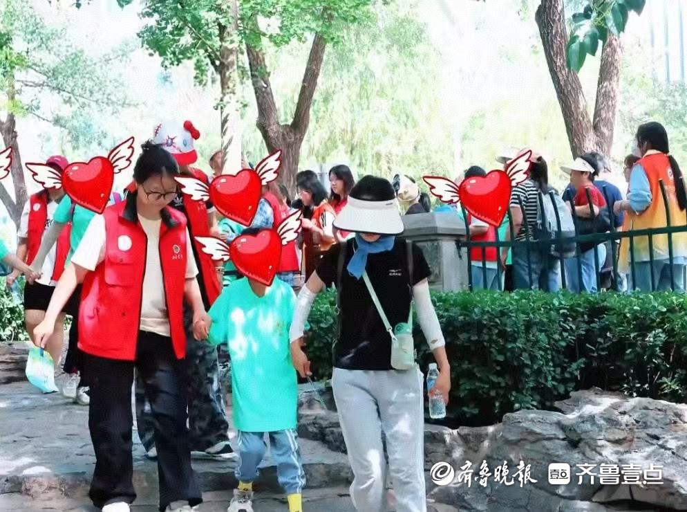 齐鲁工大学生志愿者正陪伴孤独症孩子参加健步走活动。