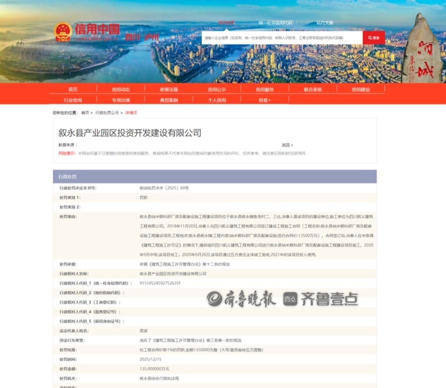 近日,叙永县综合行政执法局公布一份行政处罚决定书,对叙永县产业园区投资开发建设有限公司处以135万元罚款。该公司在未取得施工许可证的情况下,擅自组织施工单位进场施工,直至项目完工并投入使用。