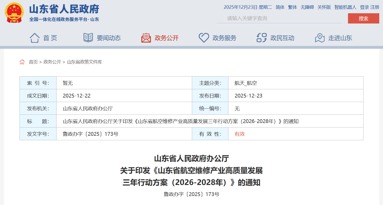 12月23日,山东省政府网站发布《山东省航空维修产业高质量发展三年行动方案(2026-2028年)》(以下简称方案),推动航空维修产业高质量发展,培育现代服务业发展新优势。