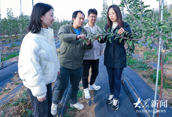 李媛媛教授(右一)在果园内与学生们一起查看苹果树生长情况(资料图)。