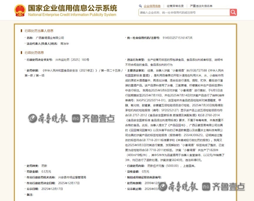 近日,兴安县市场监督管理局公布一份行政处罚决定书,对广西秦堤酒业有限公司处以罚款5000元的行政处罚。该公司因其生产的“小秦调酒”产品标签未完整标注全部原料成分,违反了食品安全相关法规。