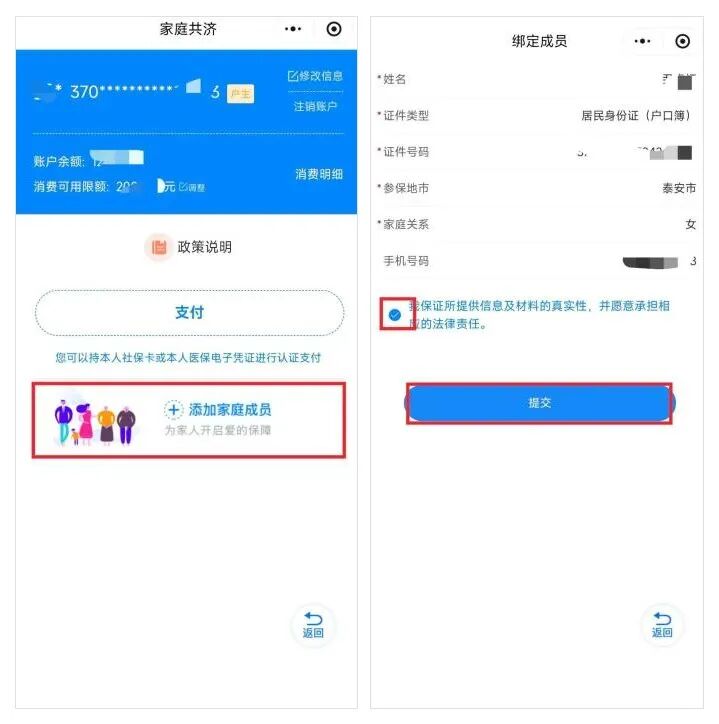 3、点击“添加家庭成员”按钮,参保职工通过人脸认证校验身份信息,进入绑定成员信息录入页面,录入信息并勾选承诺书,点击“提交”完成个账共济绑定。
