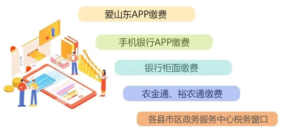 爱山东APP缴费、手机银行APP缴费、银行柜面缴费、农金通、裕农通缴费、各县市区政务服务中心税务窗口等