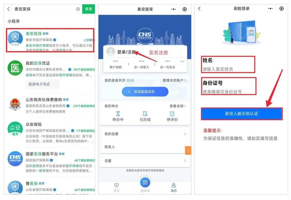1、打开微信搜索“泰安医保”小程序(首次登录需要输入姓名、身份证号和进行人脸识别认证)。