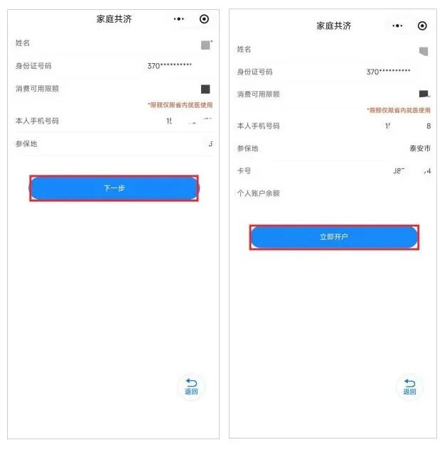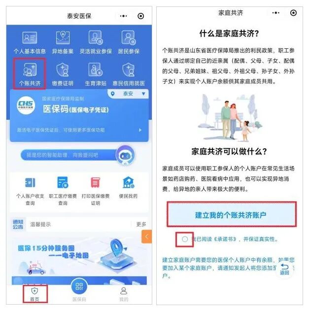2、点击“个账共济”--“建立我的个账共济账户”,输入消费可用限额、本人手机号码,点击“下一步”,确认家庭共济相关信息后点击“立即开户”。