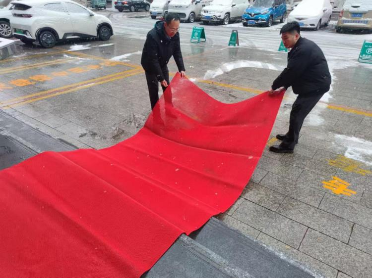 降雪导致路面湿滑,给前来办理业务的客户尤其是老年客户带来了出行隐患。农行工作人员及时搬运防滑垫至网点入口处,默契配合、细致操作,认真抻平、铺展、压实防滑垫,确保每一处都贴合地面,为客户搭建起一条安全的通行通道。这抹醒目的红色防滑垫,在皑皑白雪中成为了温暖的风景线。