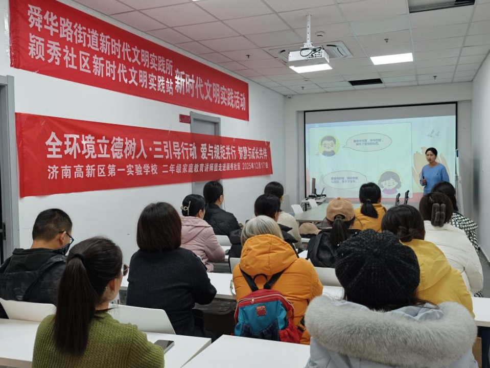 为深入推进全环境立德树人 “三引导” 行动,将科学的家庭教育理念与方法送到家长身边,近日,济南高新区第一实验学校联合新东方社区开展 “爱与规矩并行” 家庭教育指导进社区活动。学校教师单湘慧以真实案例为引,用通俗的语言、实用的技巧,为社区 0-12 岁儿童家长带来了一场干货满满的育儿分享,让孝亲敬老的传统美德浸润家庭,让家校社协同育人的力量温暖社区。