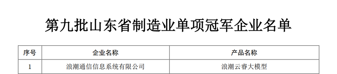 近日,山东省工业和信息化厅公示第九批山东省制造业单项冠军企业名单,浪潮通信信息凭借“浪潮云睿大模型”成功入选,这也是本次名单中唯一入选的大模型产品。