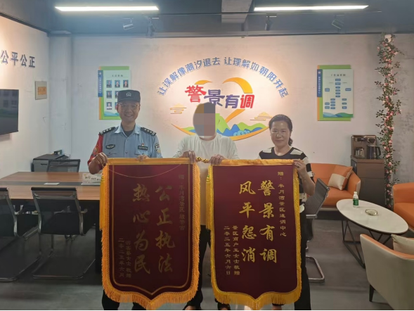 纠纷圆满解决后,王女士与蔡女士不约而同给中心送来锦旗,一面锦旗上写着“警景有调、风平怨消”,另一面则写有“公正执法、热心为民”。“两面锦旗,一件事”,这不仅是纠纷圆满解决的标志,更是环翠区司法局践行司法为民宗旨、创新“速调”机制、深化源头治理的生动缩影。
