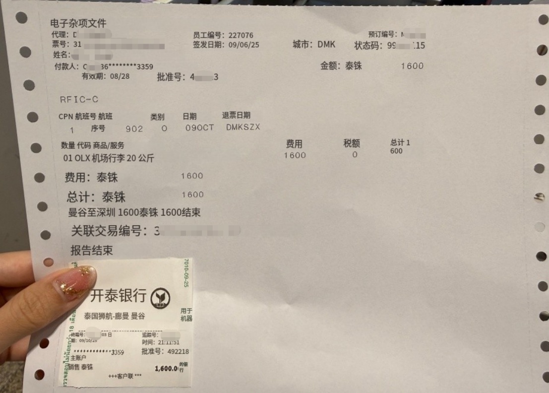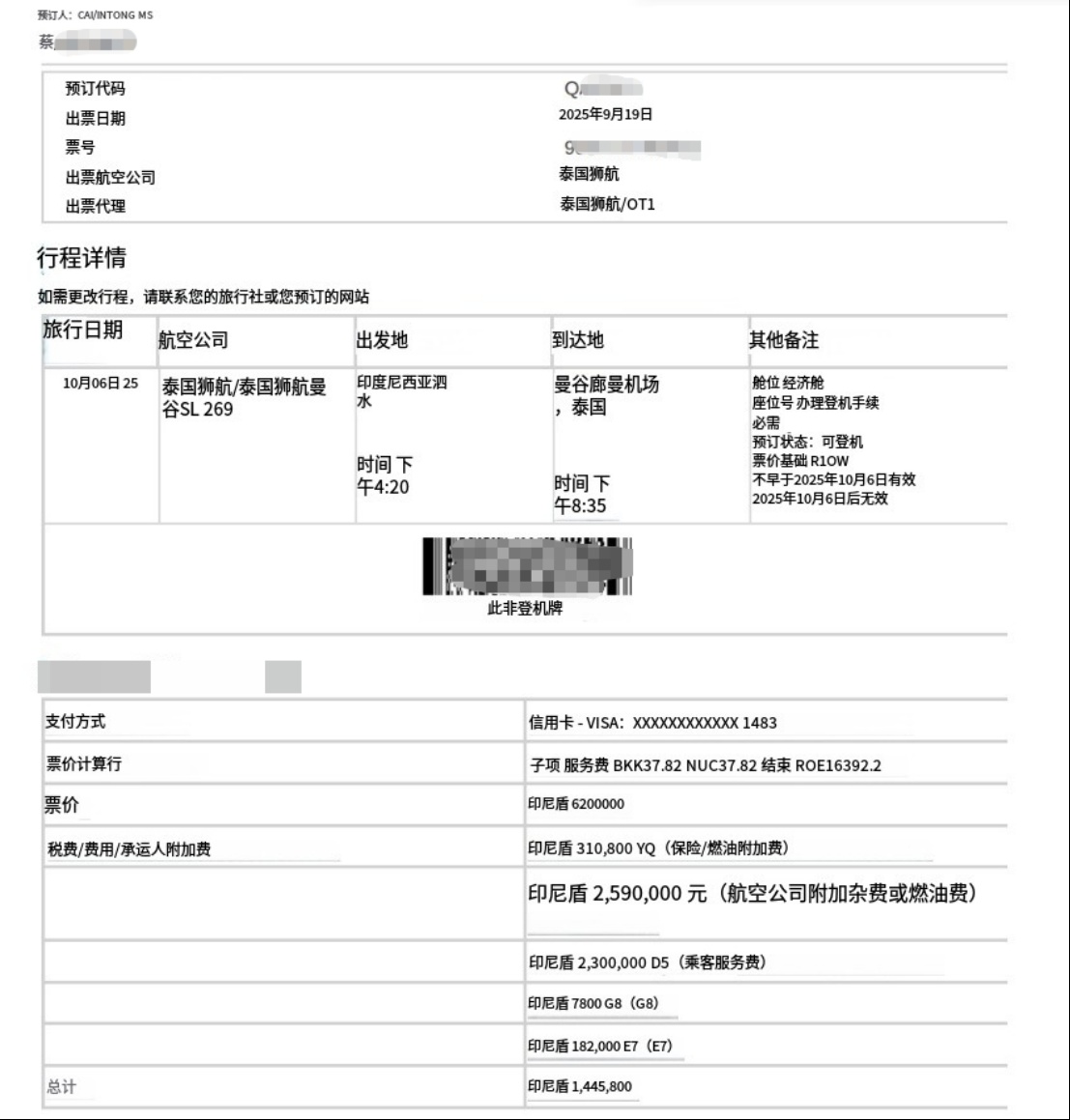 9月27日,蔡女士通过去哪儿网平台,提前购买了2张10月9日由曼谷飞往深圳的机票,总计花费2498元,内含接送机优惠券等多项出行服务,以及航空公司的行李托运折扣等多项购票权益。