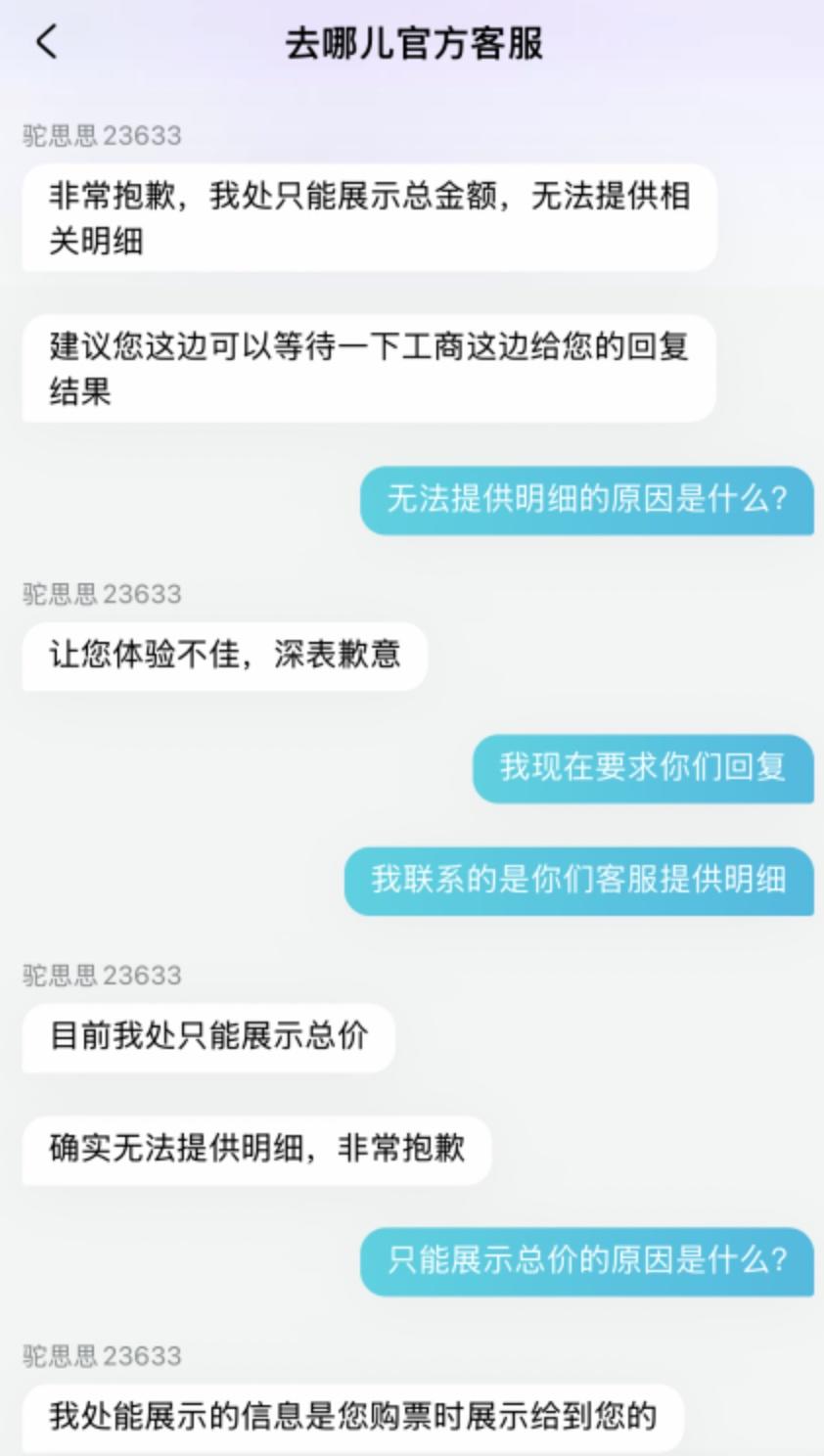 “我曾多次联系去哪儿网客服,对方均告知我需查询核实,要我耐心等待,但始终无法解决我的问题。这让我对这笔交易产生了怀疑,于是我要求对方提供费用明细,对方却表示无法提供。”