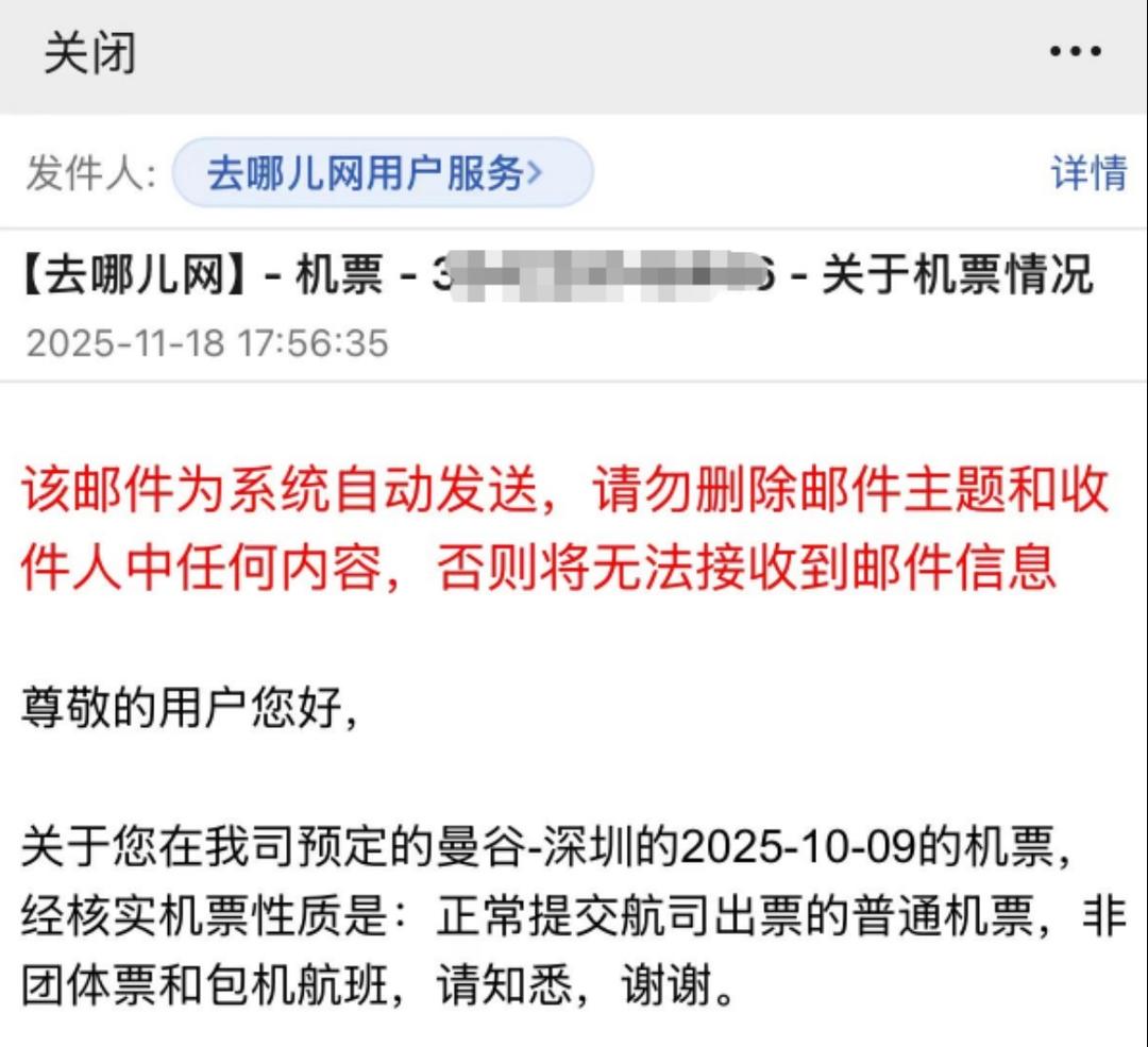 在与平台沟通无果后,蔡女士曾向执飞的泰国狮航工作人员咨询过原因,工作人员表示,该次航班为包机航班。而去哪儿网平台则表示,蔡女士购买的机票性质是正常提交航司出票的普通机票,非团体票和包机航班。