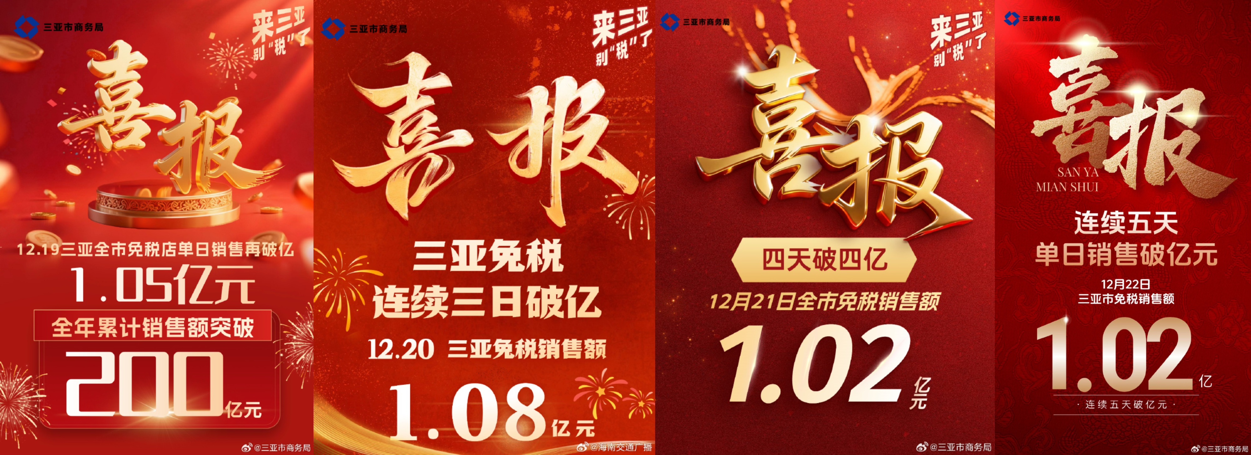 自12月18日,海南岛启动封关“技能”以来,三亚市商务局已经连续5天发布“喜报”:12月18日至22日,三亚全市的免税销售额分别为1.18亿元、1.05亿元、1.08亿元、1.02亿元和1.02亿,连续5天破亿。