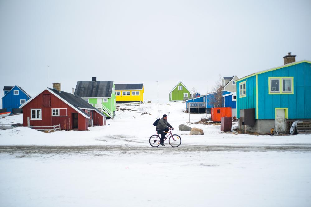 3月22日,在丹麦自治领地格陵兰岛纳尔萨克,一名男子在街道上骑行。新华社记者 彭子洋 摄