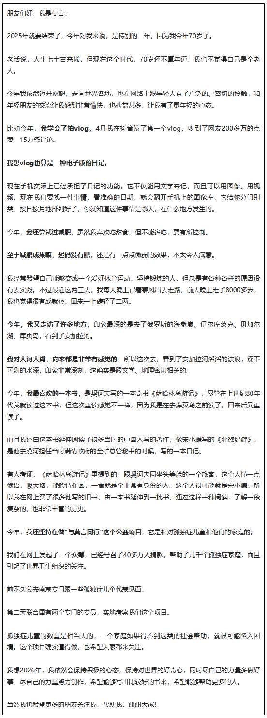 在长文中,他表示:“今年对我来说,是特别的一年,因为我今年70岁了。”提及自己今年首次尝试以vlog形式记录生活;坦言减肥成效微弱,但坚持每晚步行锻炼,前几日达成单日八千步,体重轻了二两,感到“很有成就感;自己最喜欢的一本书,是契诃夫写的一本奇书《萨哈林岛游记》;“与莫言同行”项目已吸引超40万人参与捐款,帮助数千孤独症家庭,并引起世界卫生组织关注。