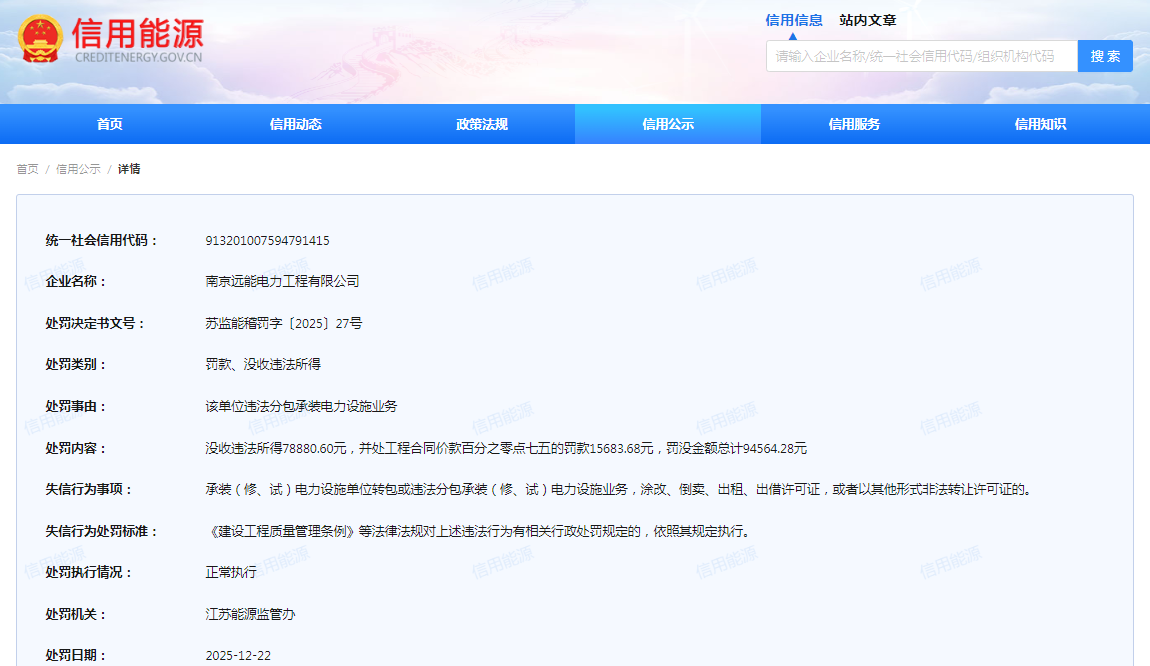 齐鲁晚报·齐鲁壹点记者于信用能源信用公示栏获悉,12月22日,南京远能电力工程有限公司(下称“南京远能电力”)收到罚单,处罚事由是“该单位违法分包承装电力设施业务”,处罚类别为“罚款、没收违法所得”,处罚机关是江苏能源监管办。