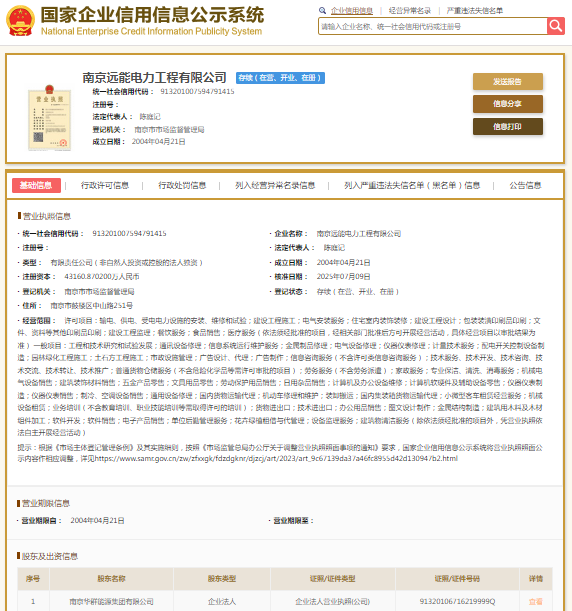 国家企业信用信息公示系统显示,南京远能电力工程有限公司成立于2004年,法定代表人陈庭记,注册资本43160.8702万元人民币,由南京华群能源集团有限公司全资持股,后者为江苏苏电产业投资发展有限公司全资子公司。