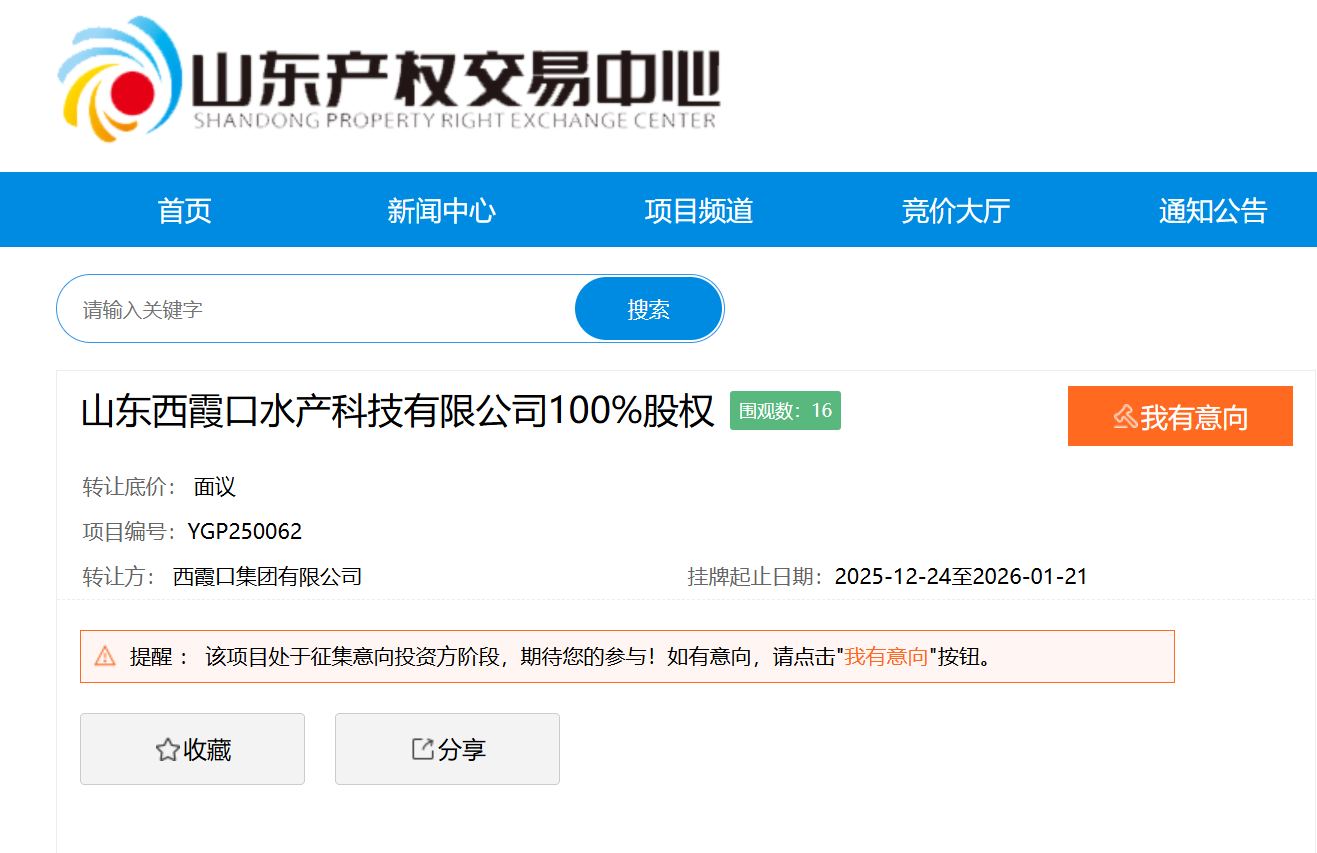 12月24日,山东省产权交易中心预披露了山东西霞口水产科技有限公司(下称“西霞口水产”)100%股权转让项目,转让方为西霞口集团有限公司(下称“西霞口集团”)。