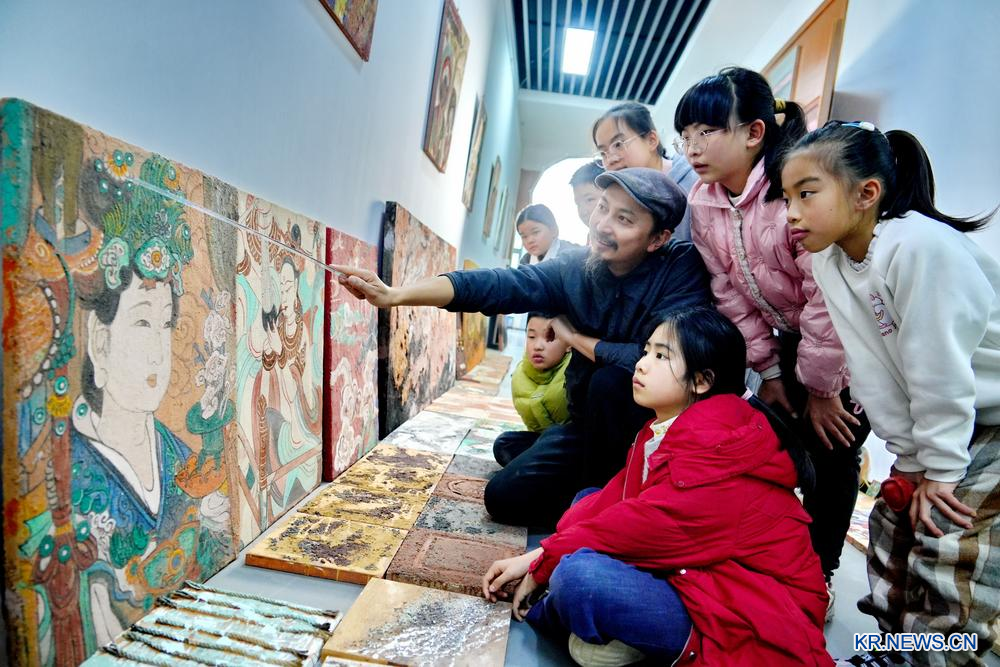 지난 20일 푸젠(福建)성 우이산(武夷山)시 문화관 암채화 공익 수업에 참여한 아이들이 암채화에 대한 설명을 듣고 있다.
