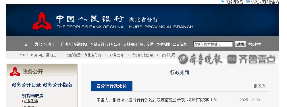 近日,中国人民银行湖北省分行发布行政处罚决定书鄂银罚决字〔2025〕28 号。