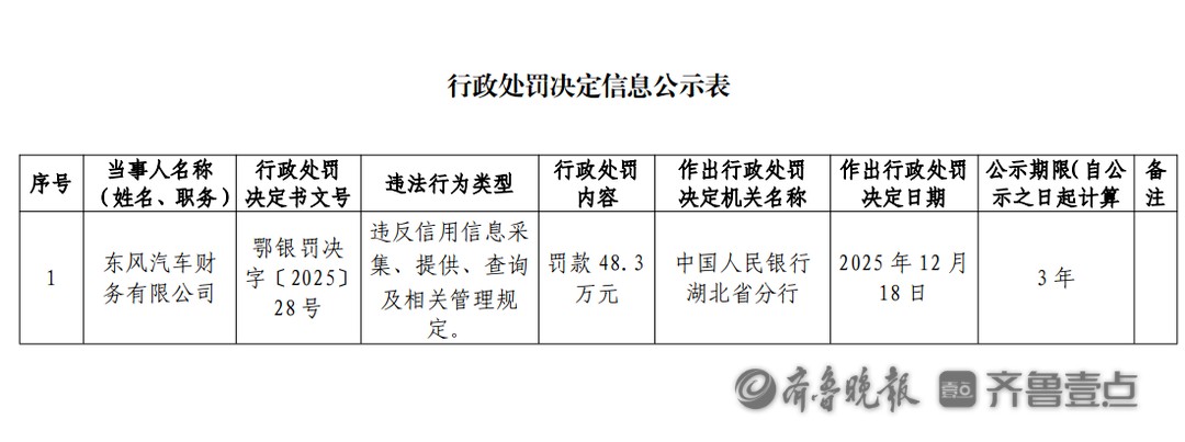 东风汽车财务有限公司因违反信用信息采集、提供、查询及相关管理规定,被罚款48.3万元。