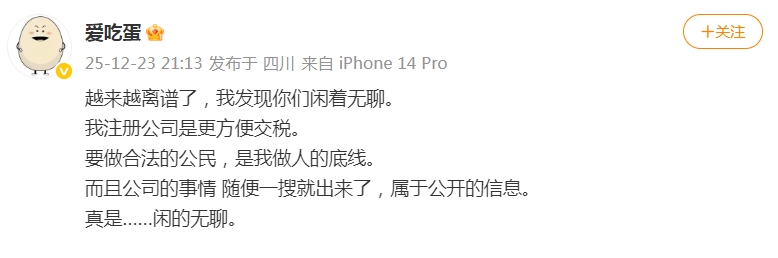 12月23日,#400万煮鸡蛋大神开公司了#登上热搜。随后,当事人@爱吃蛋发文回应:我注册公司是更方便交税。要做合法的公民,是我做人的底线。而且公司的事情,随便一搜就出来了,属于公开的信息。
