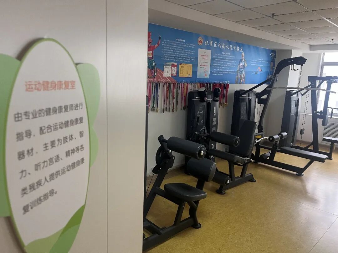 二楼运动康复训练区的手功能综合训练桌前,几位残疾人正在进行精细动作练习,指尖在器械上灵活移动;轮椅律动机旁,工作人员细心调整参数,帮助使用者完成肢体被动训练。各类针对肢体、偏瘫、脑梗患者的康复器材一应俱全,专业康复治疗师穿梭其间,随时提供指导。