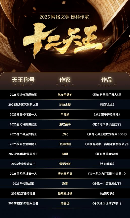 截至目前,“十二天王”累计走出近60位“大神”作家,该榜单被视为网络文学领域具有前瞻性的年度标志与重要的创作者成长阶梯。
