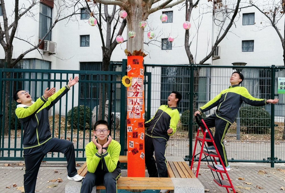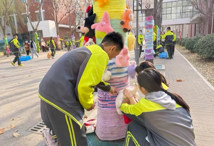行走在张店八中的校园里,有的树干点缀着学生的梦想寄语;有的编织出抽象图案,寓意生命脉络;还有的将诗词、校训融入装饰,让树木成为“会说话”的文化载体。