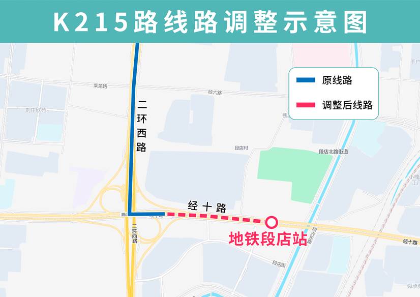 K215路优化调整后由齐州路聊城路开往地铁段店站,沿经十路向东至段兴东路调头返回,沿途增设地铁段店站站点。K215路齐州路聊城路发车时间为6:00-21:00,地铁段店站发车时间为6:35-21:35。票价二元,执行公交IC卡优惠政策。