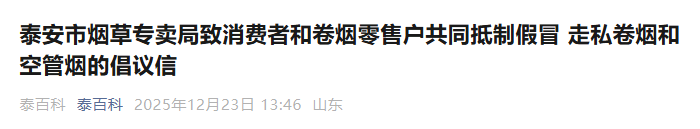 抵制涉烟违法!泰安市烟草专卖局发布倡议,附举报电话