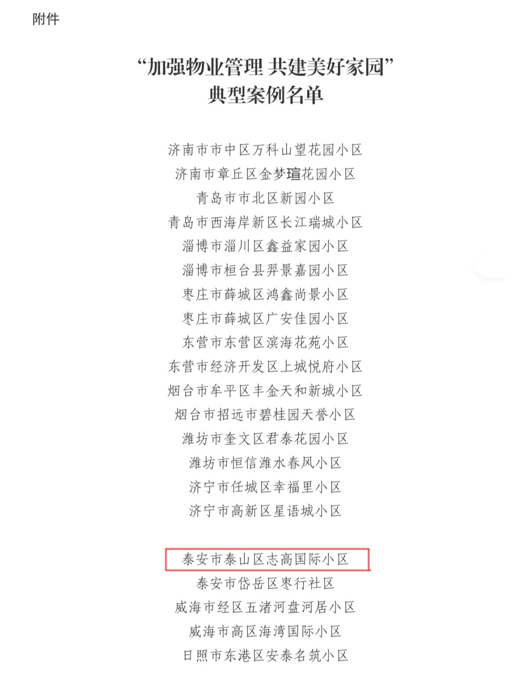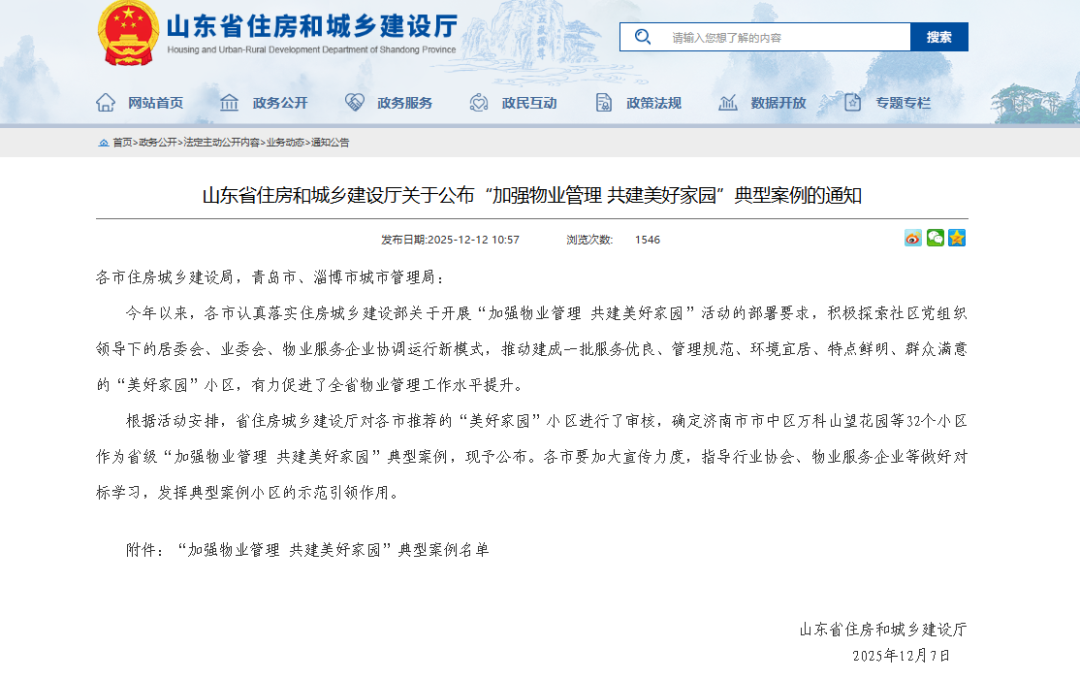近日,山东省住房和城乡建设厅正式公布“加强物业管理 共建美好家园”省级典型案例名单,泰山区志高国际小区凭借党建引领有力、服务规范优质、环境宜居宜业、群众满意度高的突出优势成功入选,成为全省32个典型案例示范小区之一。