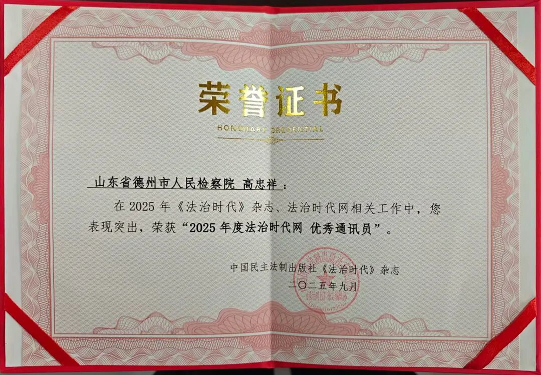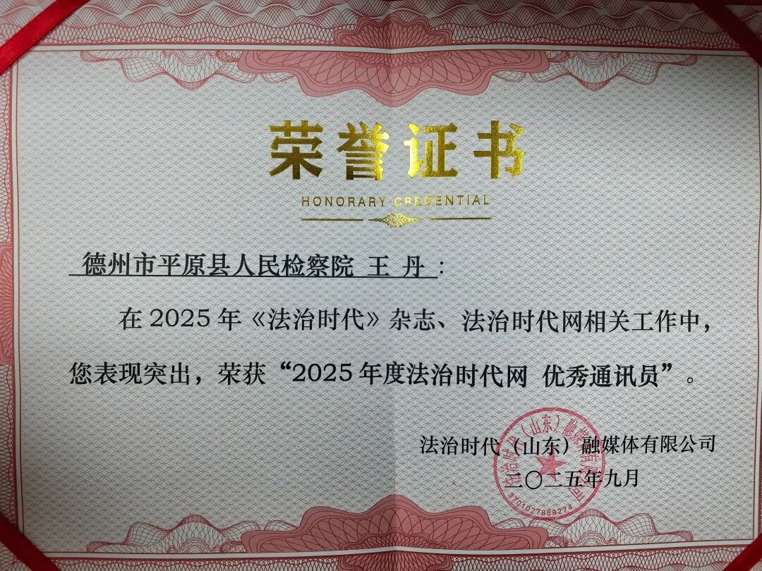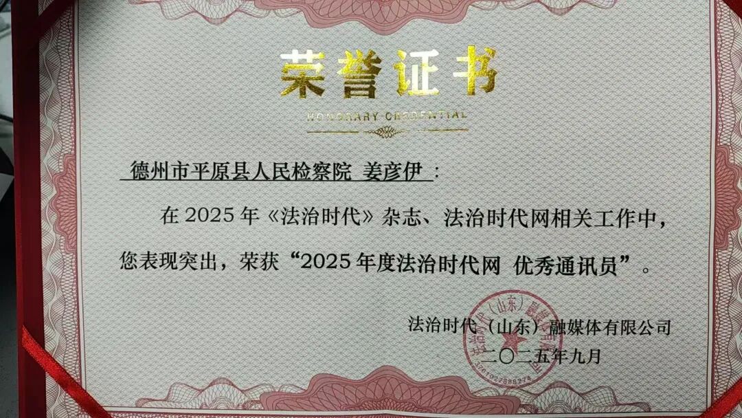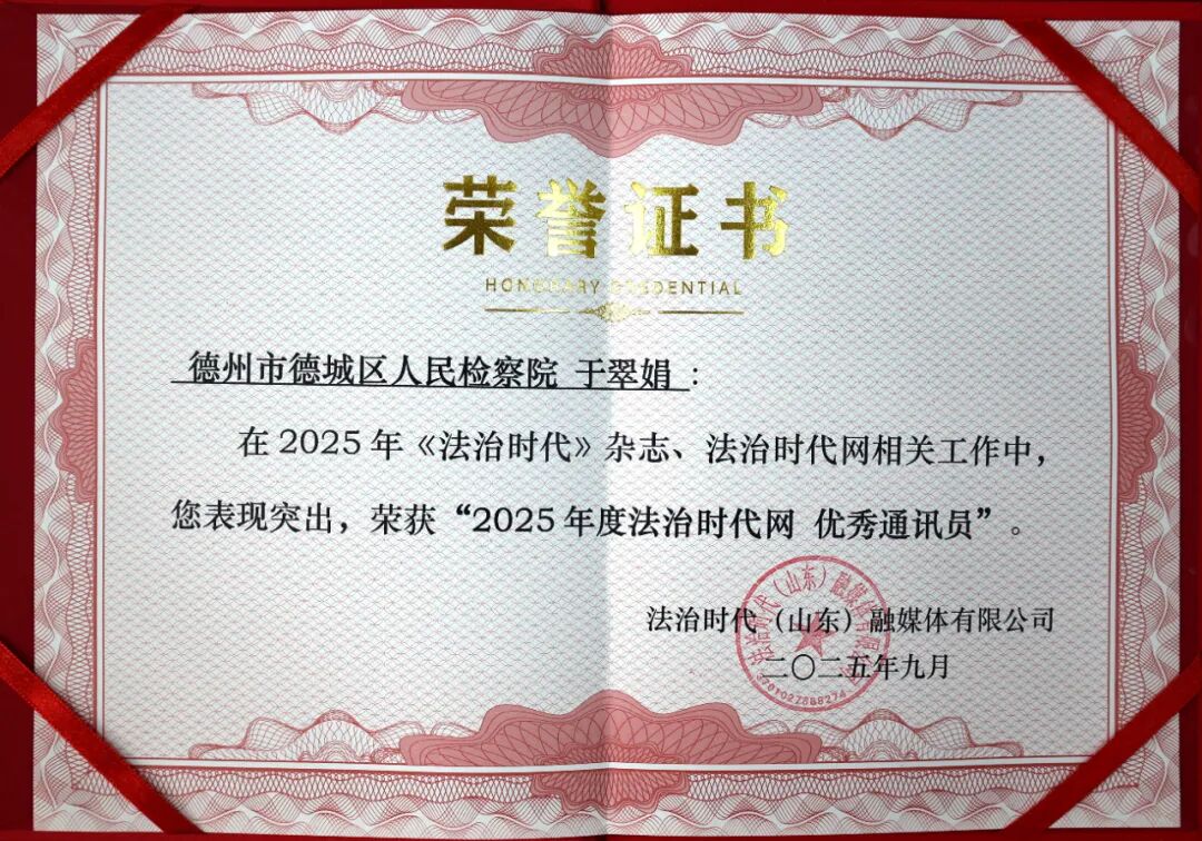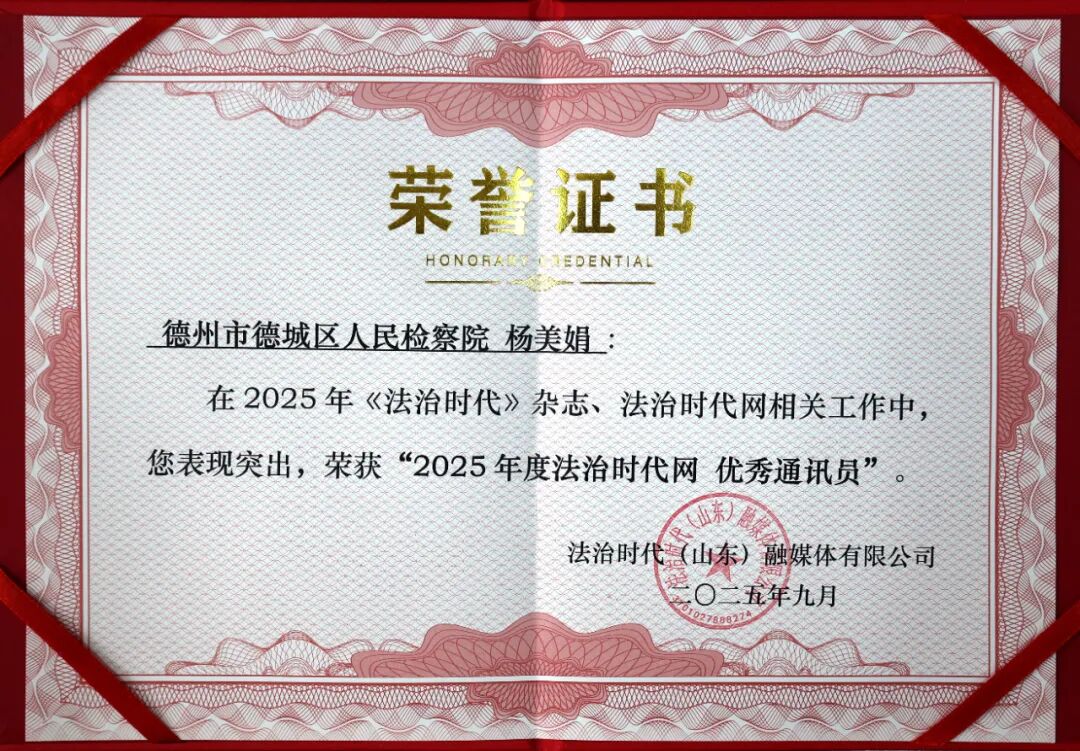 近日,中国民主法制出版社评选出“2025年度《法治时代》杂志和法治时代网先进集体和个人”,其中,德州检察机关5名干警荣获“优秀通讯员”称号。