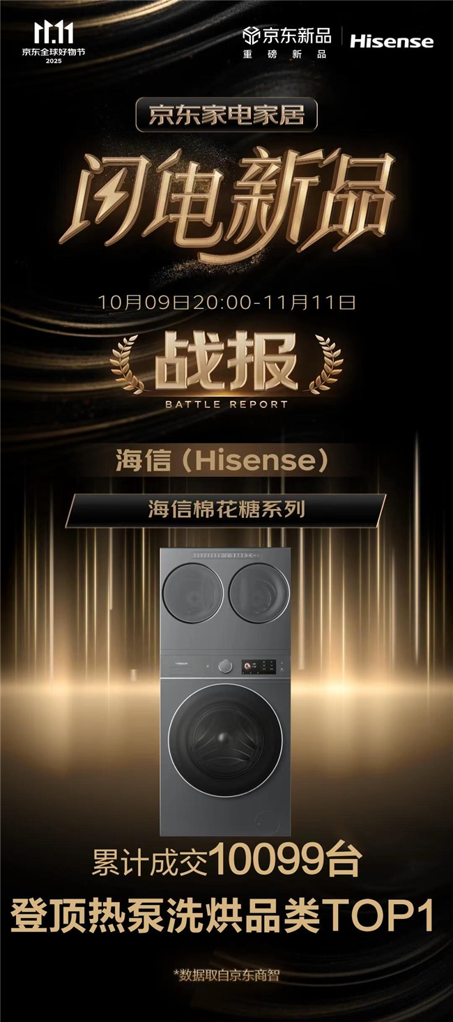 唯有将用户思维融入产品设计,才能在激烈竞争中开辟新赛道,而海信洗衣机的这份坚守已直接转化为领跑行业的市场增速。2025年前三季度,海信洗衣机国内主营业务收入同比增长30%以上,增速领先行业。海信全家筒上市以来接连荣获德国IFA“最佳设计奖”、奥维云网“热泵洗烘一体机线下主销价位销量第一”等权威奖项。在此基础上,海信洗衣机继续将热泵洗烘一体机推广普及,推出热泵洗烘一体机棉花糖E8Q等新品,今年“双十一”期间海信棉花糖系列累计成交10099台,登顶京东平台热泵洗烘品类TOP1,品牌实力持续获得市场与行业的双重认可,更让“烘干选热泵,热泵选海信”深入人心。想要更充分了解和体验海信三筒洗衣机,可登陆各大电商平台搜索“海信棉花糖三筒洗衣机”,或亲临线下海信洗衣机专柜,现场感受其卓越性能。