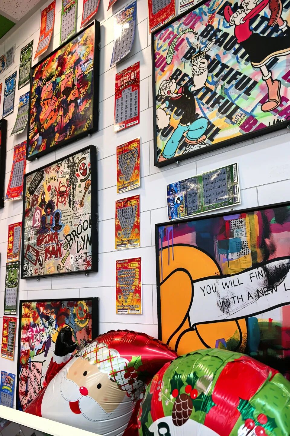 该店以“魔法城堡”的独特外形以及夸张的极繁主义内饰,强调丰富的装饰、复杂的图案和大胆的色彩,通过高饱和度色彩、动漫手绘插画海报、互动式灯光装置营造沉浸式体验,打造年轻化公益空间:墙面手绘的“蜡笔小新”“大力水手”“疯狂原始人”“蜘蛛侠”等经典动漫角色与刮刮乐废票拼贴艺术墙,既把刮刮乐作为一种艺术展示,又传递“随手公益 一起造福”的理念。圣诞期间,店内增设的星空灯珠、圣诞摆件与“公益心愿墙”联动,吸引年轻人勇敢表达自我,拍照分享,让公益传播更具社交属性。信息密集、共创共享、玩梗不断的全新“福彩+”销售场所,不仅迎合了Z世代流行文化的面貌,更在邀请青年消费群体体验“随手公益”的同时,成为“Z世代文化暗号”的共创者。