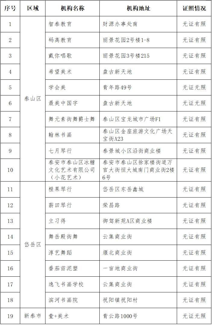 全市范围内所有无证办学的校外培训机构,要认清当前规范整治的严峻形势,主动向当地教育部门咨询学习《泰安市教育局关于解决校外培训机构办学许可证相关问题的解决方案》文件要求,严格遵守规定,树立合规意识,停止违规运营,全面自查办学条件,弥补自身短板,尽快向当地相关审批部门提交资质申请材料,依法依规完善办学手续,迈向合法办学,共同营造健康有序的校外培训市场环境。
