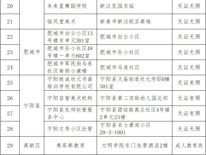 为贯彻落实中共中央办公厅、国务院办公厅《关于进一步减轻义务教育阶段学生作业负担和校外培训负担的意见》(中办发〔2021〕40号)精神,进一步规范面向中小学生(含幼儿园儿童)及成人文化教育类的校外教育培训机构办学行为,促进校外培训机构规范有序发展,营造公平竞争的市场环境,经摸排,发现全市共有29家证照不全培训机构,违规开展培训,现将29家机构列入“黑名单”向社会公布。