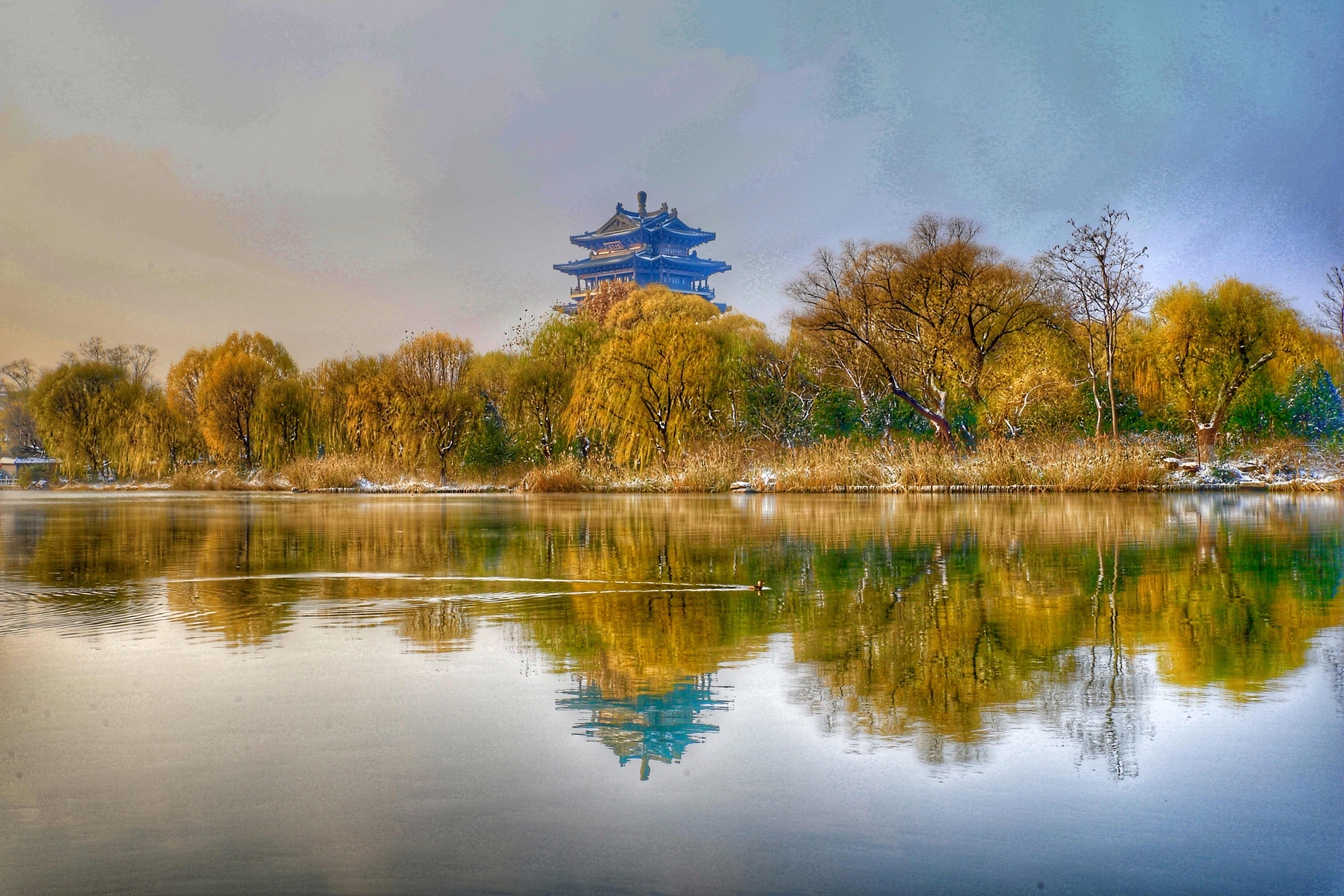冬日晴好大明湖一隅静水如镜倒映出超燃楼与彩林的绰约风姿一只水鸟划破湖面漾开动人的涟漪为静谧冬景添上灵动一笔雪与冬的清寒交织古意与生机碰撞尽显明湖冬日秀于形灵于心的独特韵味齐鲁师范学院董洪日拍摄