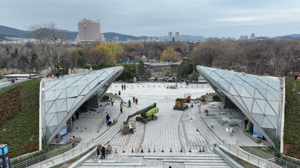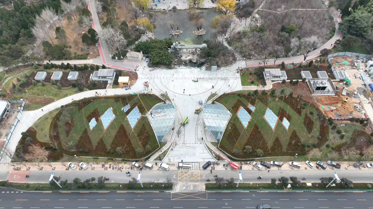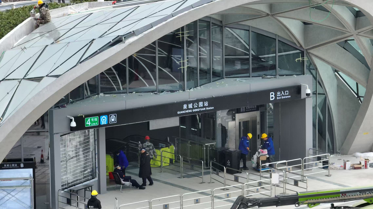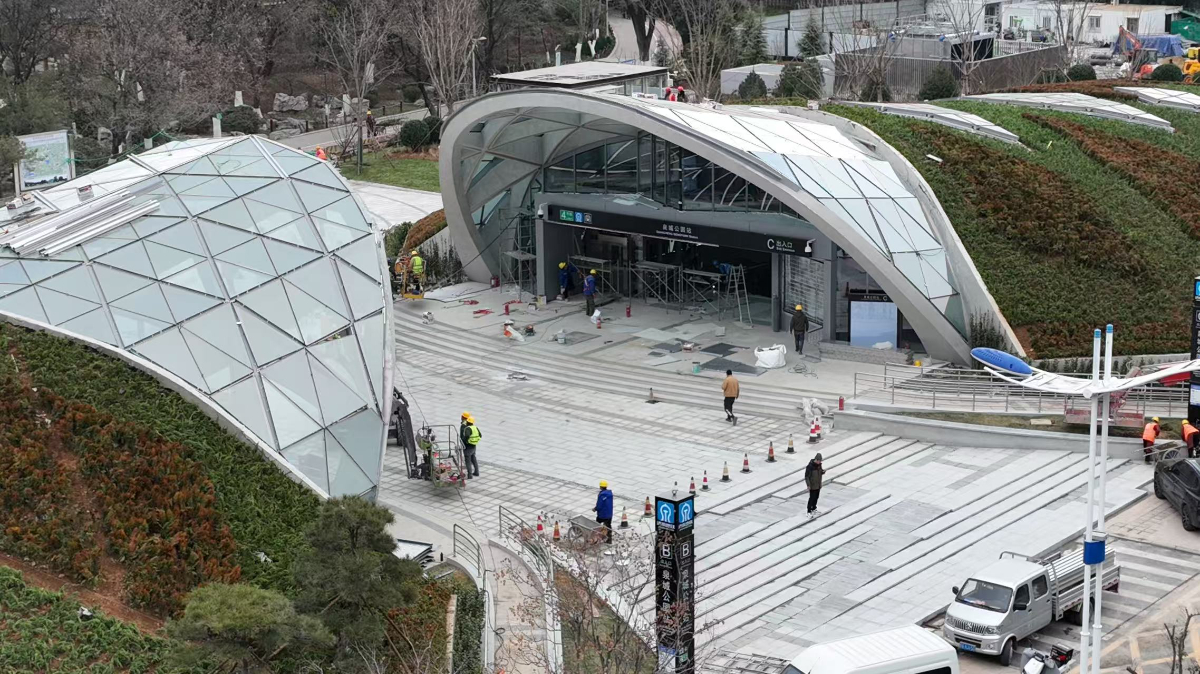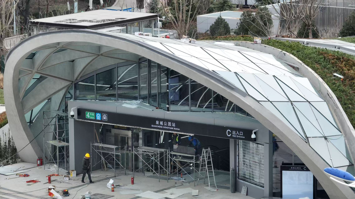 12月22日,航拍济南地铁4号线泉城公园站,拱形玻璃下的两个出入口已经进入最后装修阶段,工人们进进出出忙碌着。齐鲁晚报·齐鲁壹点记者 王媛