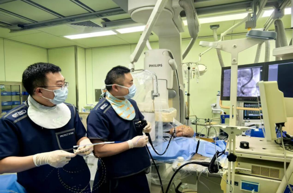手术当天,由消化内科介入组、张念亮麻醉医师团队、内镜室护理团队组成的多学科小组严阵以待,介入手术室内各类监护设备全程运转,医护人员全神贯注投入手术准备。