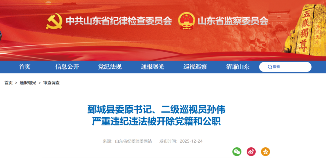 山东省纪委监委网站12月24日消息,鄄城县委原书记、二级巡视员孙伟严重违纪违法被开除党籍和公职。