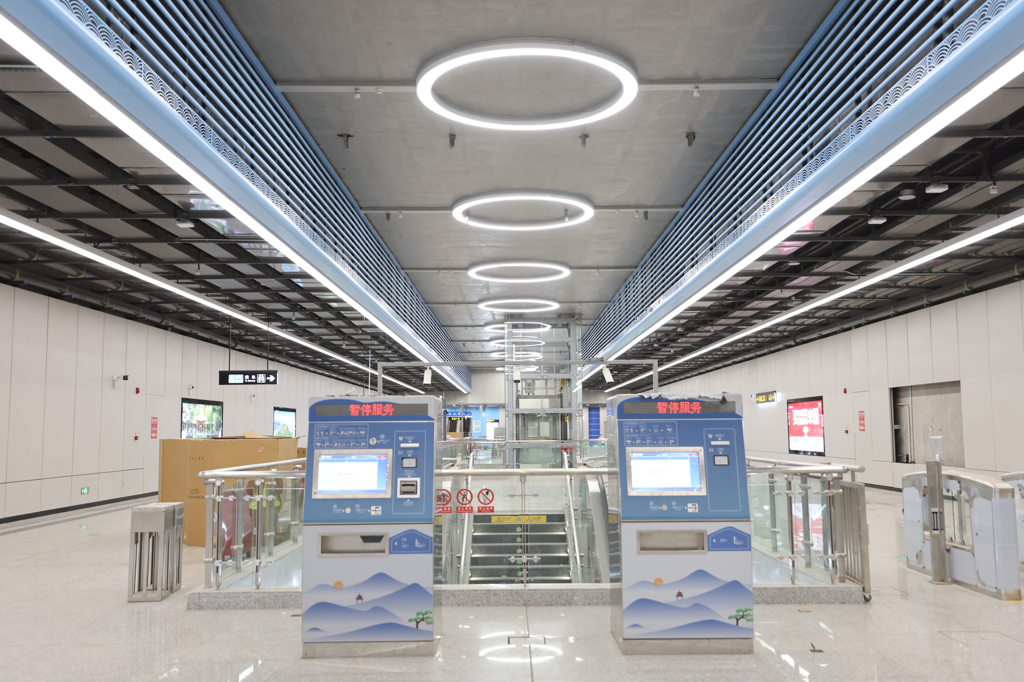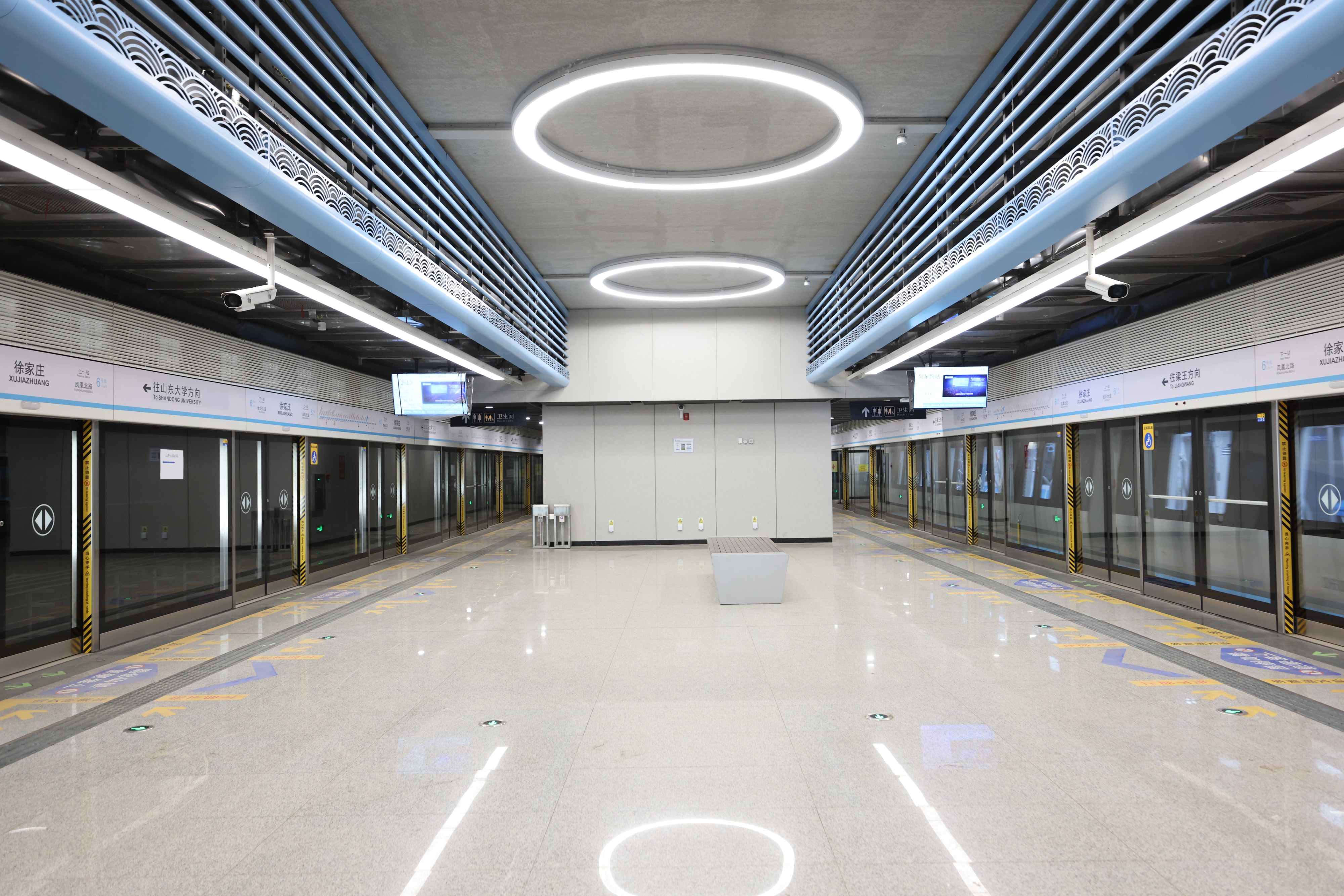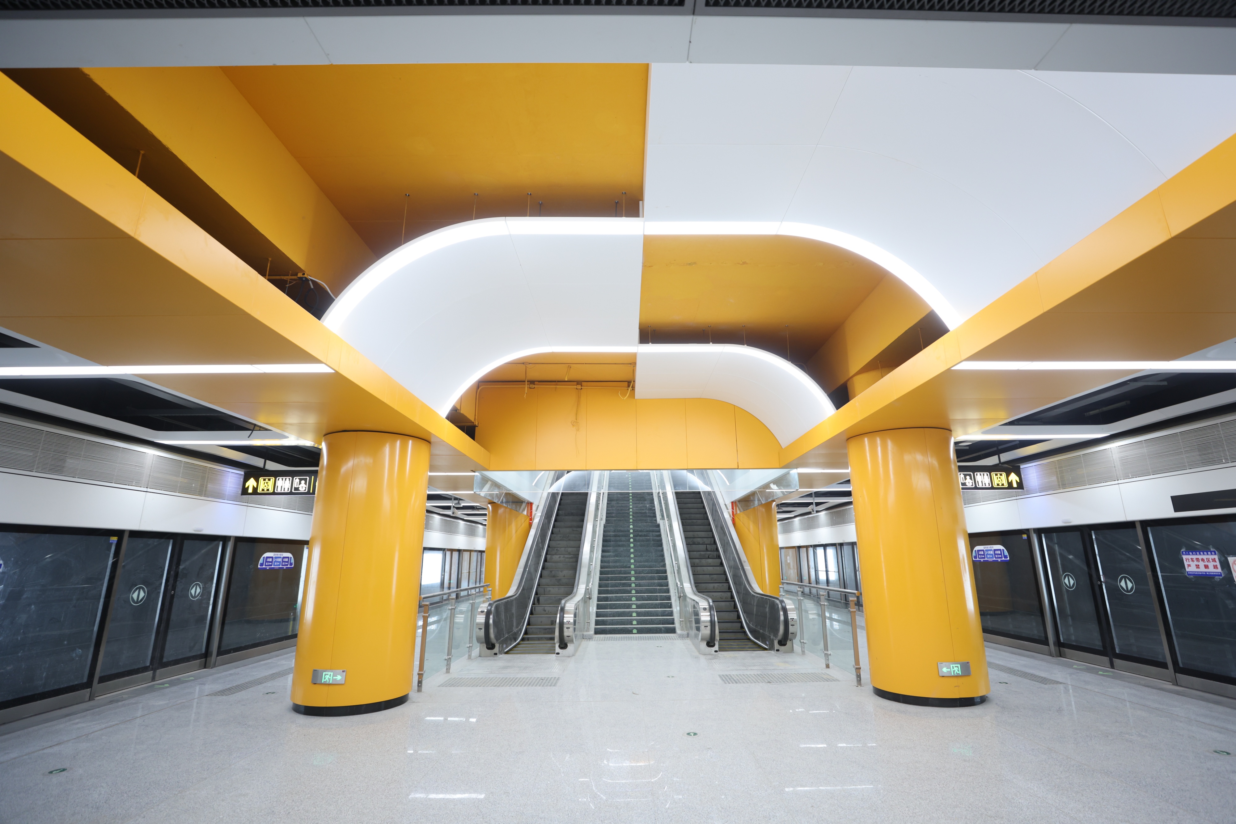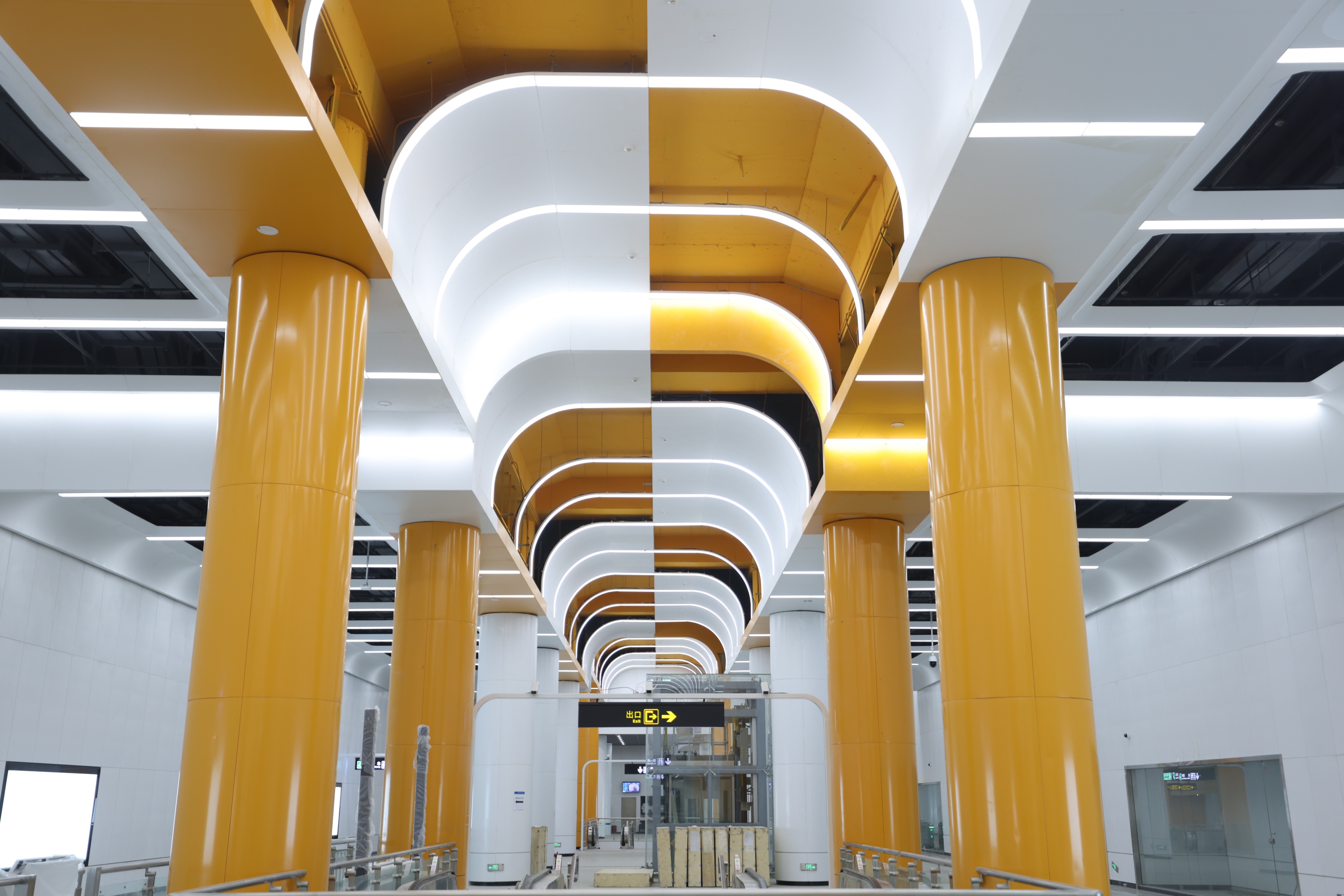 这条线路衔接济南东部科创高地与高校区域,设计师团队提出“以科技创造新城市”的主题,延续1号线清水混凝土风格,强调功能性与艺术性的统一,实现“标准化不标准,模块化不单调”的设计效果。