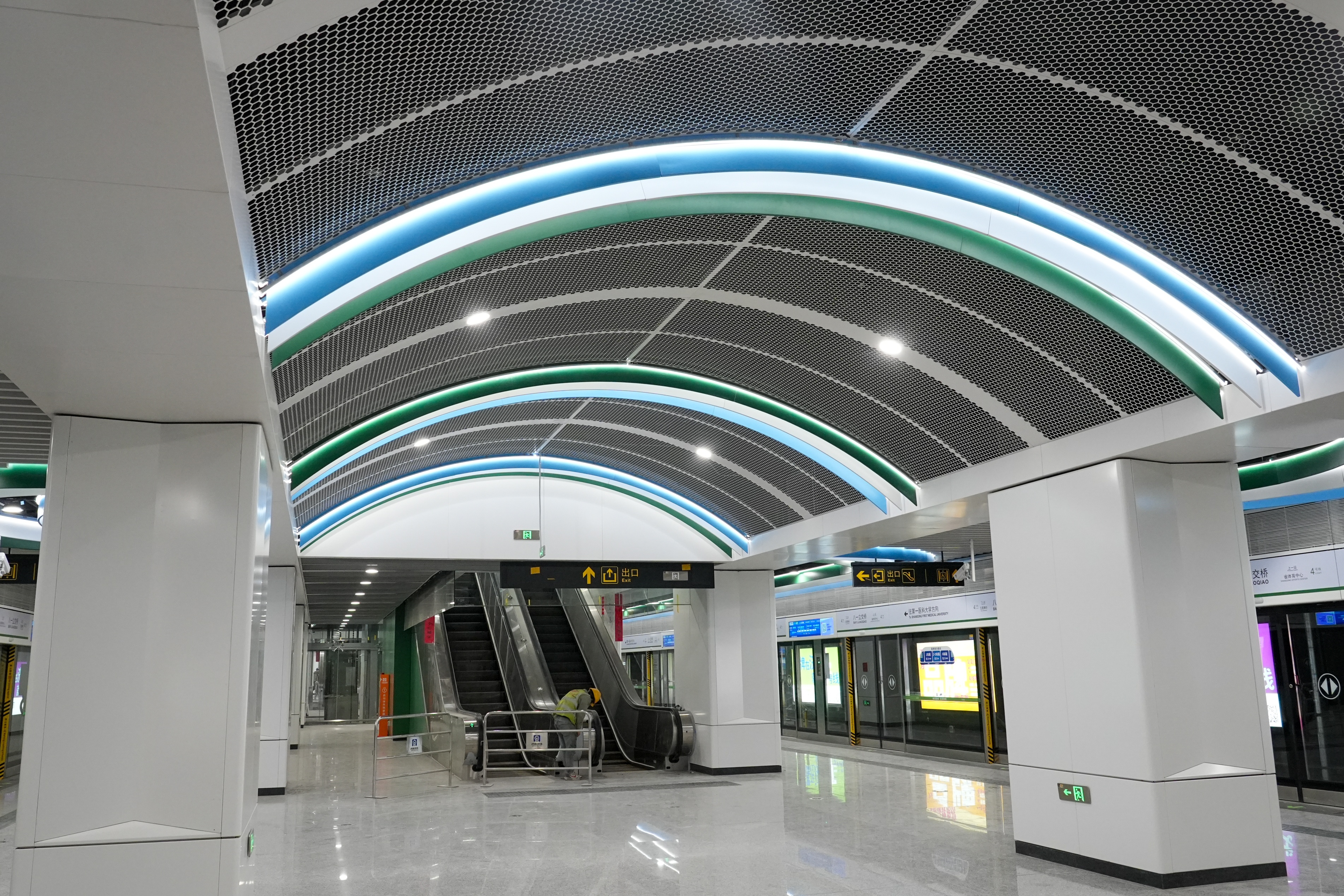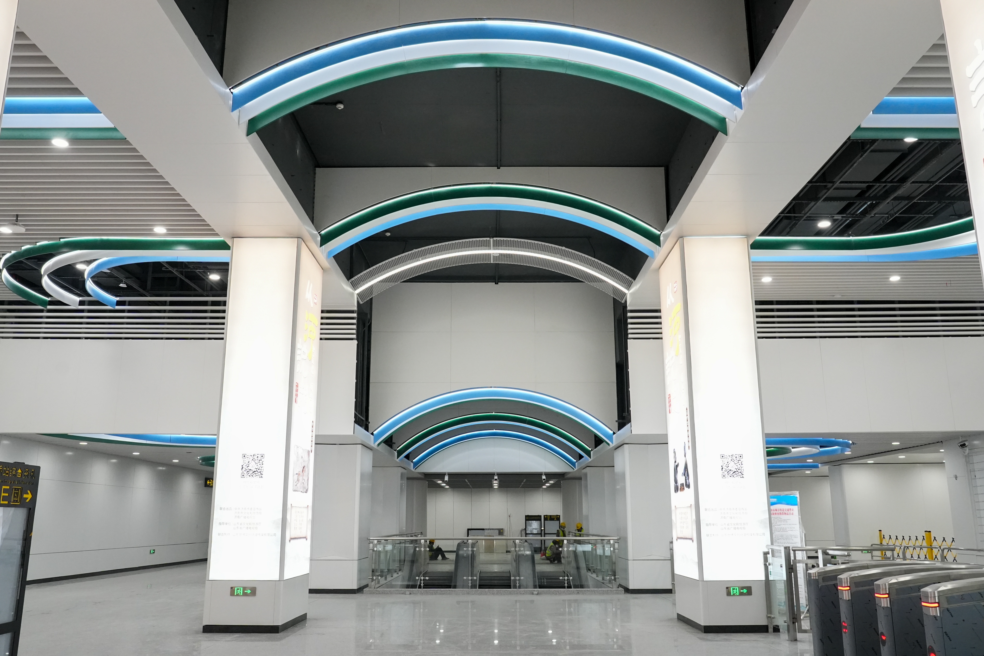 汉峪金谷站位于经十路与凤凰路交叉口西南侧,沿经十路呈“一字型”布置。此站立足商务区属性,通过模块化构件与渐变色彩的运用,艺术化表达“金谷·腾飞”的意象,既呼应区域金融中心的现代气质,也隐喻地铁带来的发展机遇,让乘客在穿行中感受到城市进阶的脉搏。