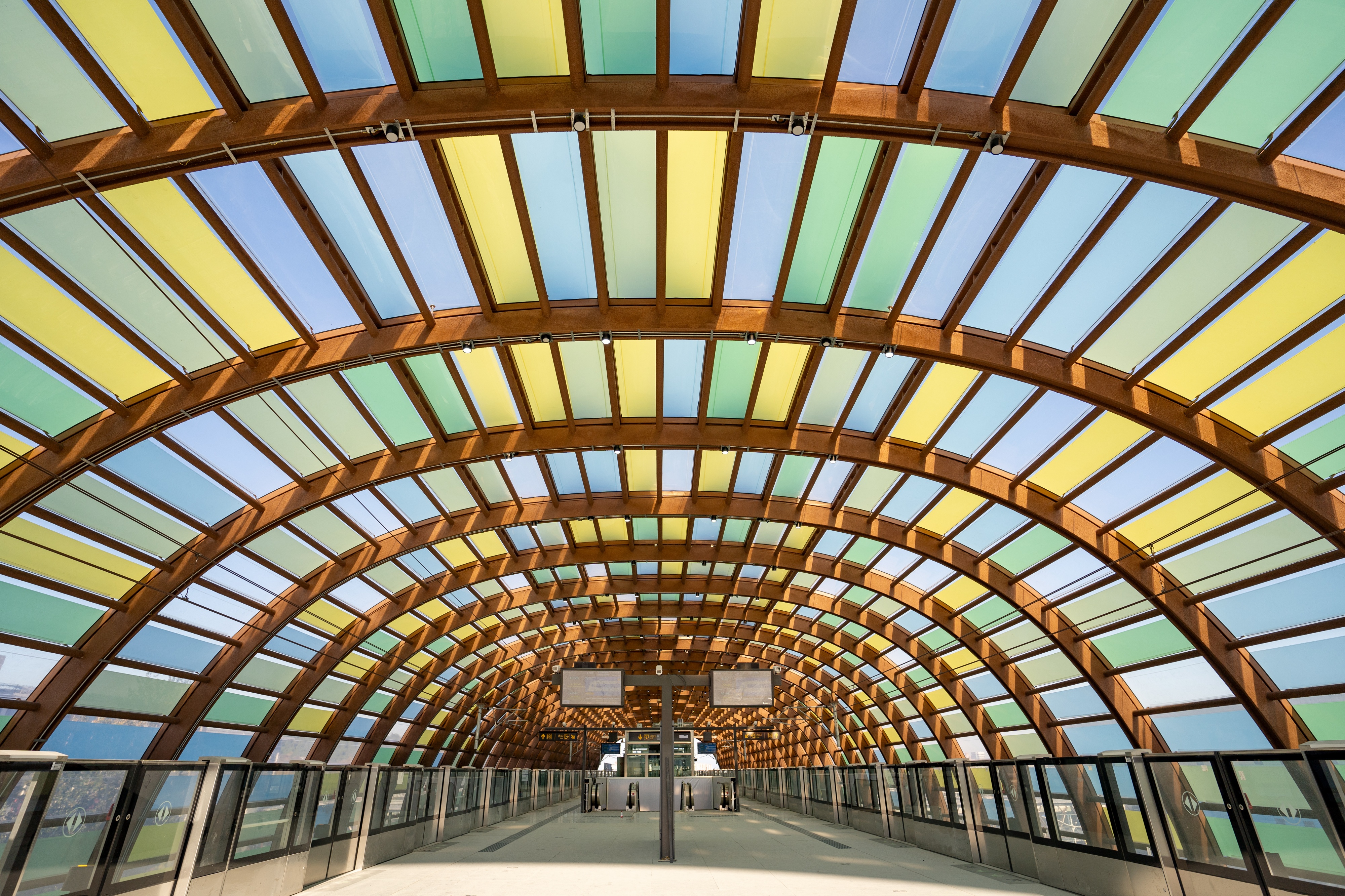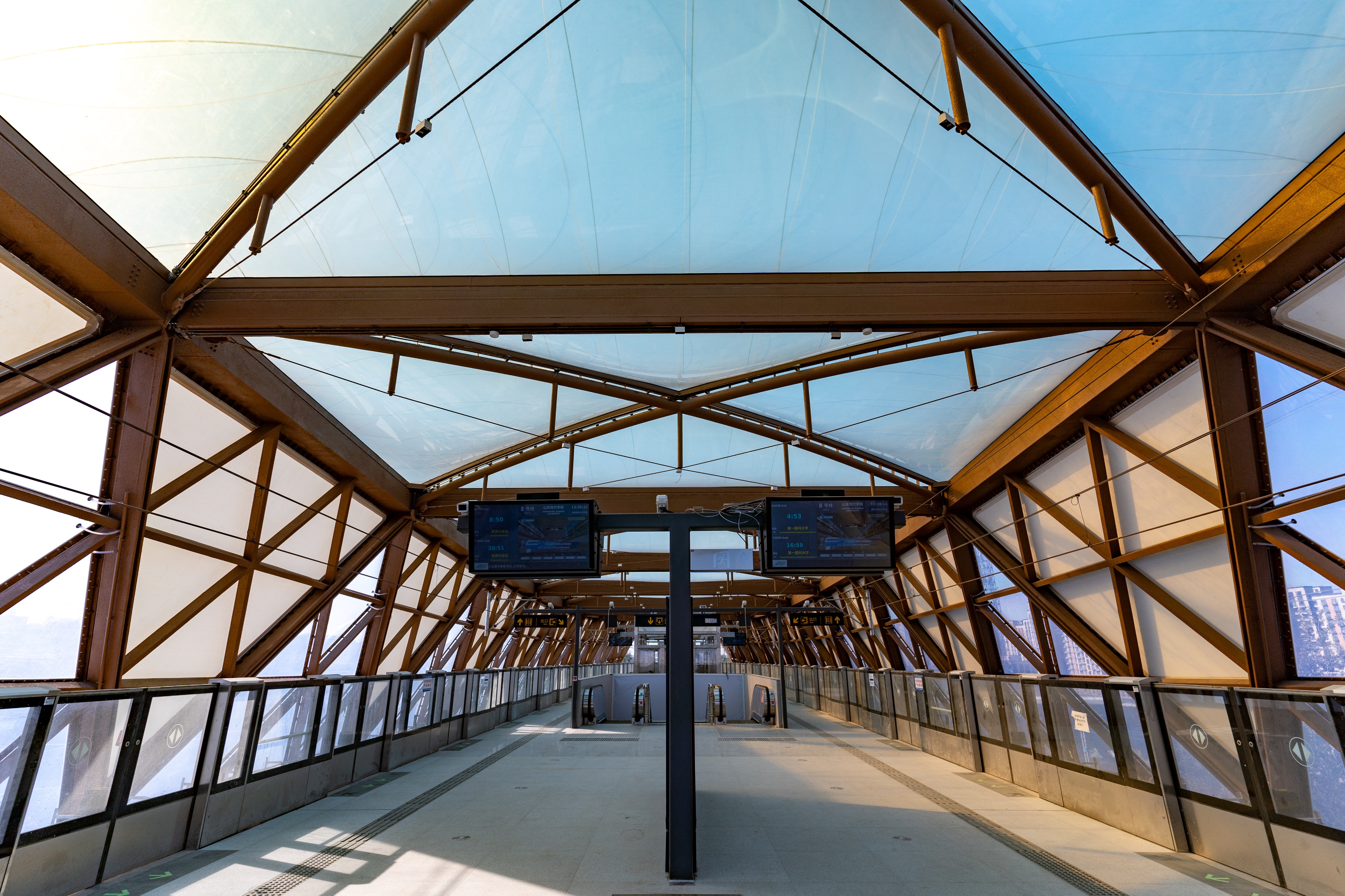 公路技师学院站紧邻超算中心,以轻质材料创新与形态美学表达为策略,ETFE膜材料呈现丰富光影,其绚丽的色彩设计,灵感来源于当地彩石街道流传的“女娲炼五彩石补天”的神话传说,将现代科技与传统文化完美融合。