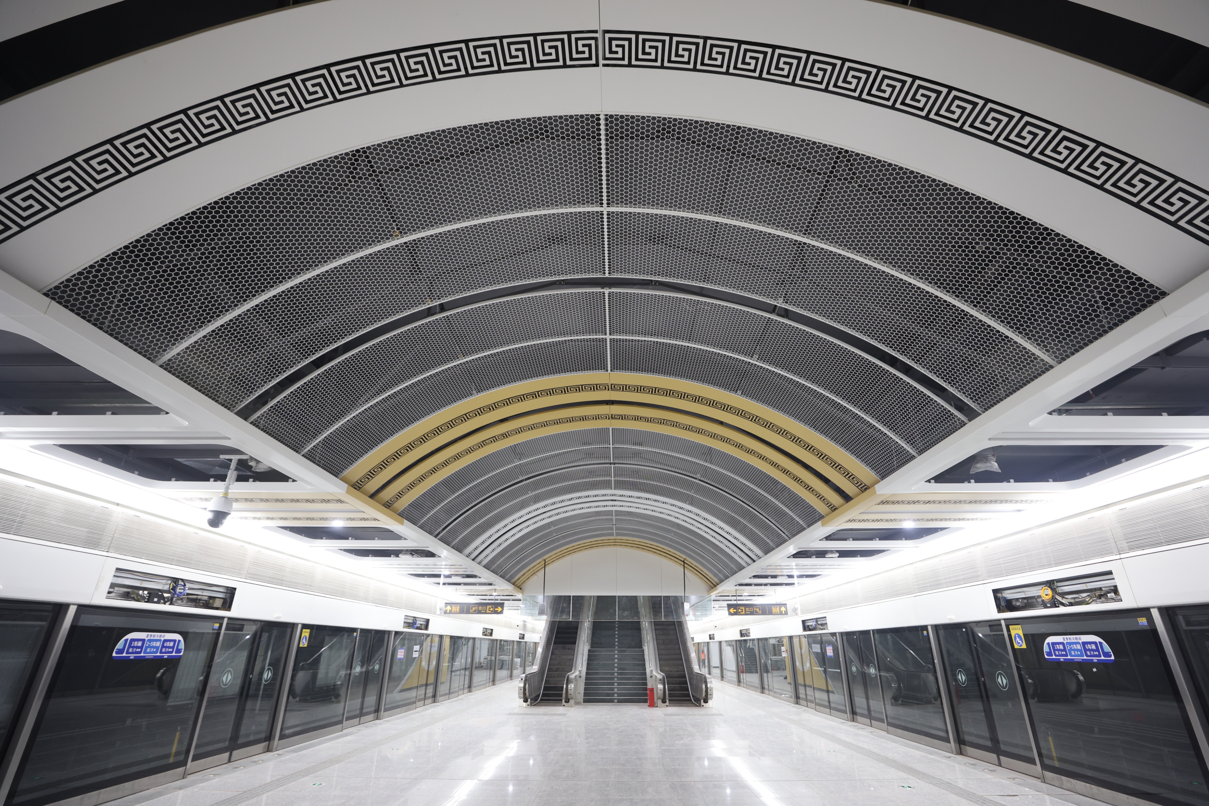 4号线山东博物馆站,使用中国传统纹样回字纹装饰,古朴厚重,拱顶和方窗体现“天圆地方”的理念。