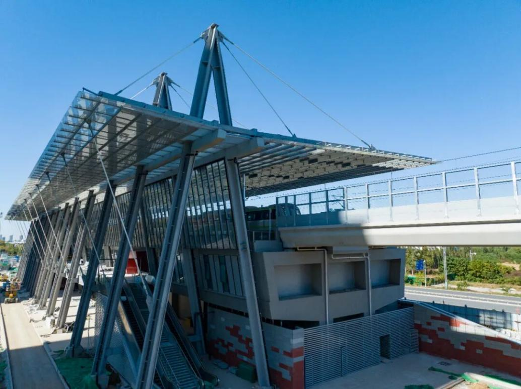 车站在结构设计上颇具特色,雨棚为悬挑形式,宽度约为40米,悬挑最大跨度约28.5米,设计钢结构约2000吨,是全线高架车站雨棚钢结构中最复杂的一座车站。车站按照中国绿色城市轨道交通建筑最高等级和LEED金级标准进行设计、施工。车站采用建筑光伏一体化设计,光伏玻璃兼做车站雨棚,预计年发电量约18万千瓦时,可满足车站部分用电需求,此外还配备雨水回收系统,采用绿色建材,搭配智慧运维系统,具有节能、节水、节材、安全舒适、智慧运行的特点。