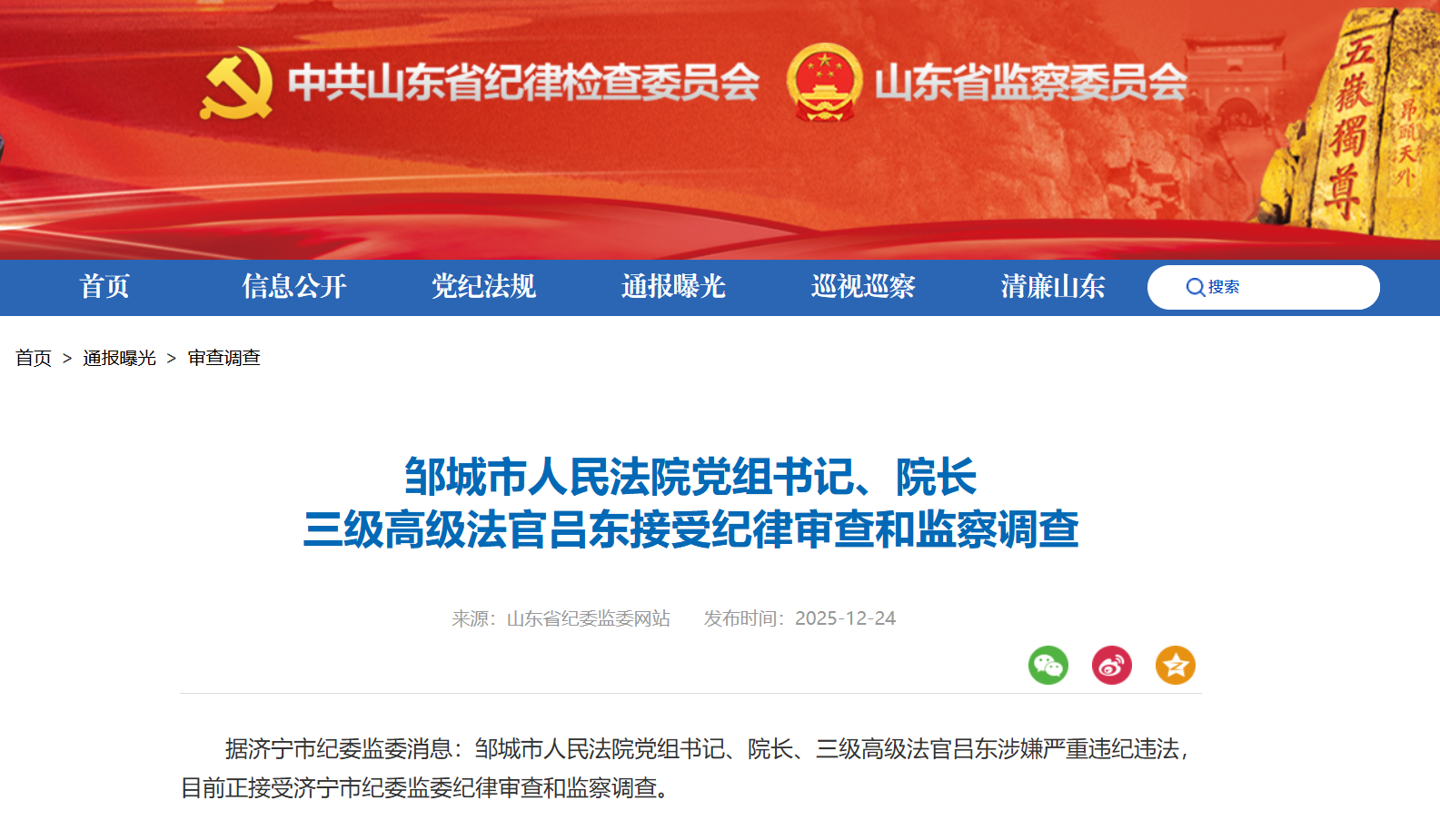 邹城市人民法院党组书记、院长吕东接受审查调查观政 | 2025-12-24 16:40:46 原创范佳来源:齐鲁晚报·齐鲁壹点客户端微信扫码扫码下载客户端山东省纪委监委网站12月24日消息,邹城市人民法院党组书记、院长、三级高级法官吕东涉嫌严重违纪违法,目前正接受济宁市纪委监委纪律审查和监察调查。责任编辑:范佳