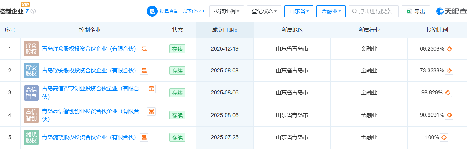 经济导报记者注意到,除了上述基金外,今年以来泸州老窖在青岛成立了多家股权投资合伙企业。今年7月成立了青岛瀚璞股权投资合伙企业(有限合伙),出资额2110万元;今年8月成立3家,分别是青岛高信智创创业投资合伙企业(有限合伙)、青岛高信智享创业投资合伙企业(有限合伙)和青岛璞安股权投资合伙企业(有限合伙),出资额分别为5830万元、8540万元和3000万元。